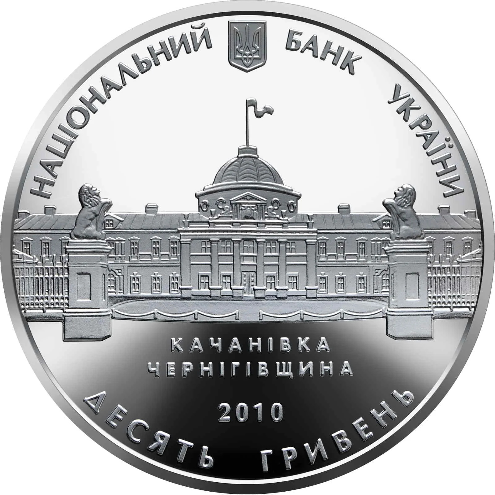 The obverse features Ukraine's Small Coat of Arms with the inscription "National Bank of Ukraine" and the year 2010. The reverse shows the Tarnovskyi mansion in Kachanivka, Chernihiv Oblast, with the face value of ten hryvnias.