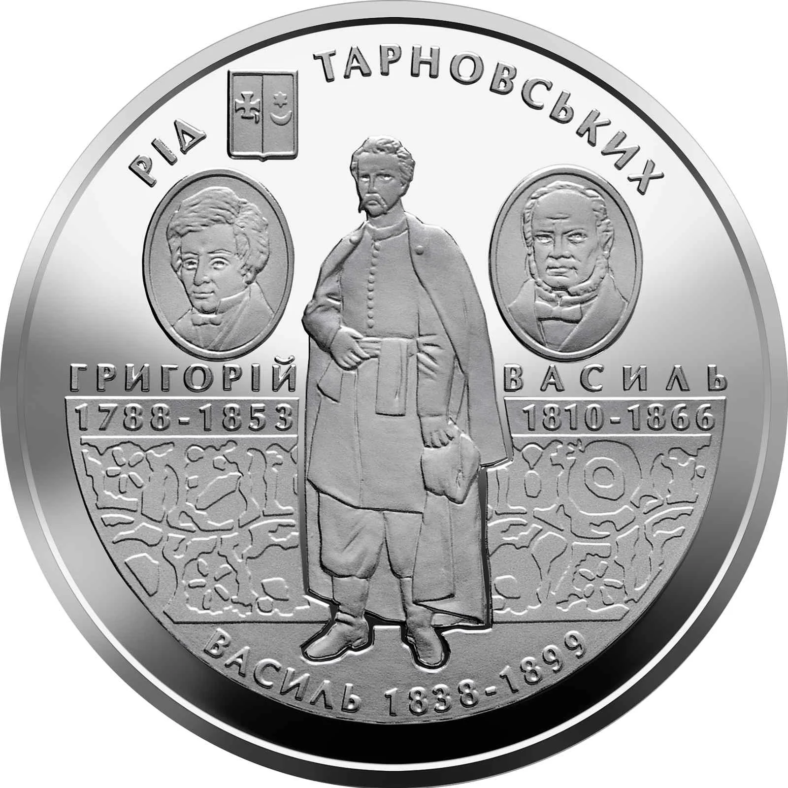 The central portrait shows Vasyl the Younger (1838–1899). To his left is Hryhorii (1788–1853) and to his right is Vasyl (1810–1866). Above is the Tarnovskyi family coat of arms and the inscription "РІД ТАРНОВСЬКИХ."