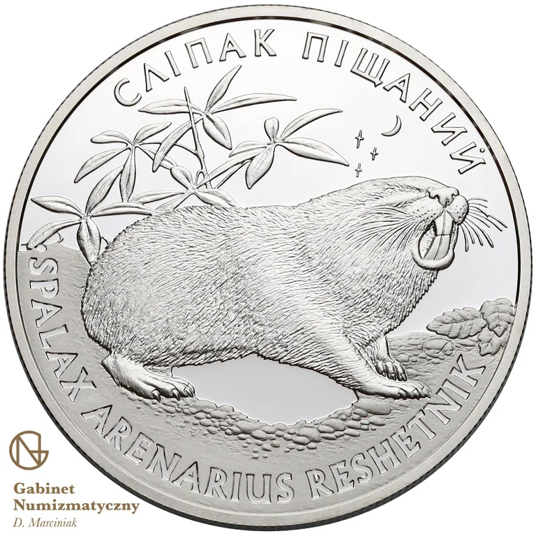 A rodent is depicted against plants (left) with inscriptions: СЛІПАК ПІЩАНИЙ above and SPALAX ARENARIUS RESHETNIK below.