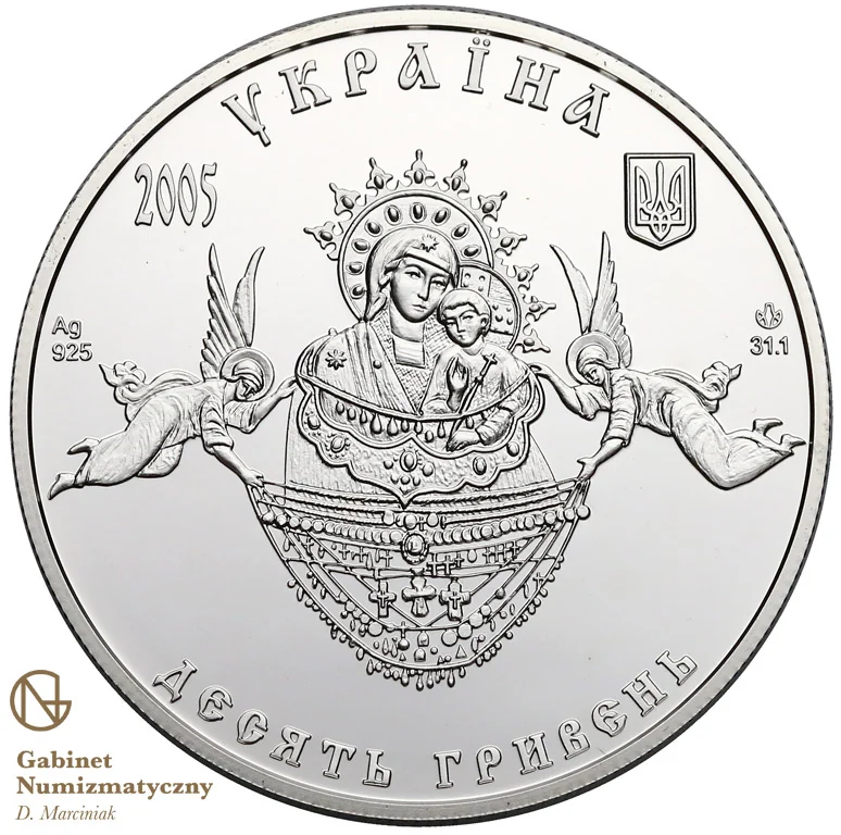 The coin features the Miracle-working icon of the Sviatohirsk Mother of God, flanked by two angels holding gifts. Above is the semicircular inscription "УКРАЇНА," with the small National Emblem and the year 2005 on either side. Below are "ДЕСЯТЬ ГРИВЕНЬ," Ag 925, 31.1 (weight), and the Mint logotype.