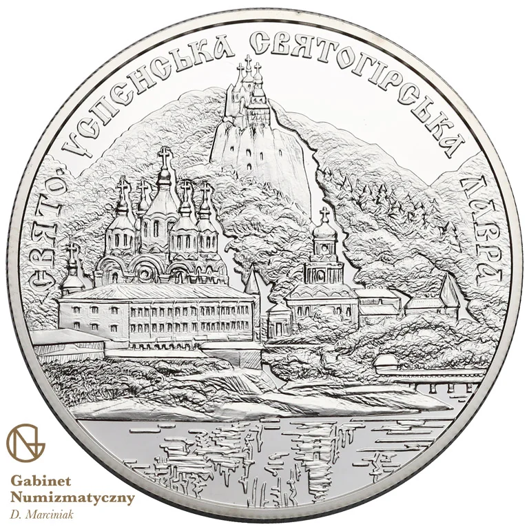 Ancient Sviatohirsk Assumption Lavra on a riverbank beneath forested chalk hills, with the semicircular inscription "СВЯТО-УСПЕНСЬКА СВЯТОГІРСЬКА ЛАВРА" above.