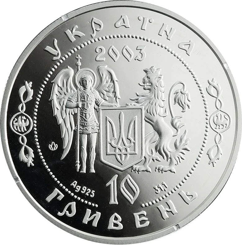 Description: This coin features a half-length portrait of Kyrylo Rozumovskyi within a beaded circle, flanked by his coat of arms (left) and the Cathedral of Virgin's Nativity in Kozelets (right). Around the rim, the inscription reads "КИРИЛО РОЗУМОВСЬКИЙ" above and his life years "1728 - 1803" below.