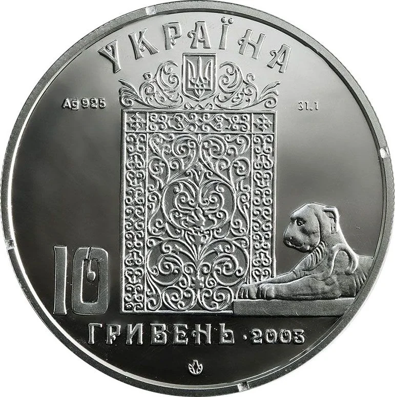 A gate fragment and lion statue are shown. Above is "УКРАЇНА," the national emblem, metal details, and weight. Below are "10," "ГРИВЕНЬ 2003," and the NBU Mint logo.