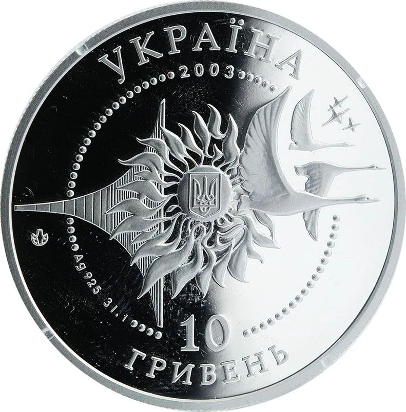 Description: A string of beads encircles the small National Emblem of Ukraine, set within an allegorical composition of the sun, a wing, birds, and stars symbolizing the dream of space exploration. Inscriptions include: УКРАЇНА, 2003, 10, ГРИВЕНЬ, along with the metal, its fineness, and weight.