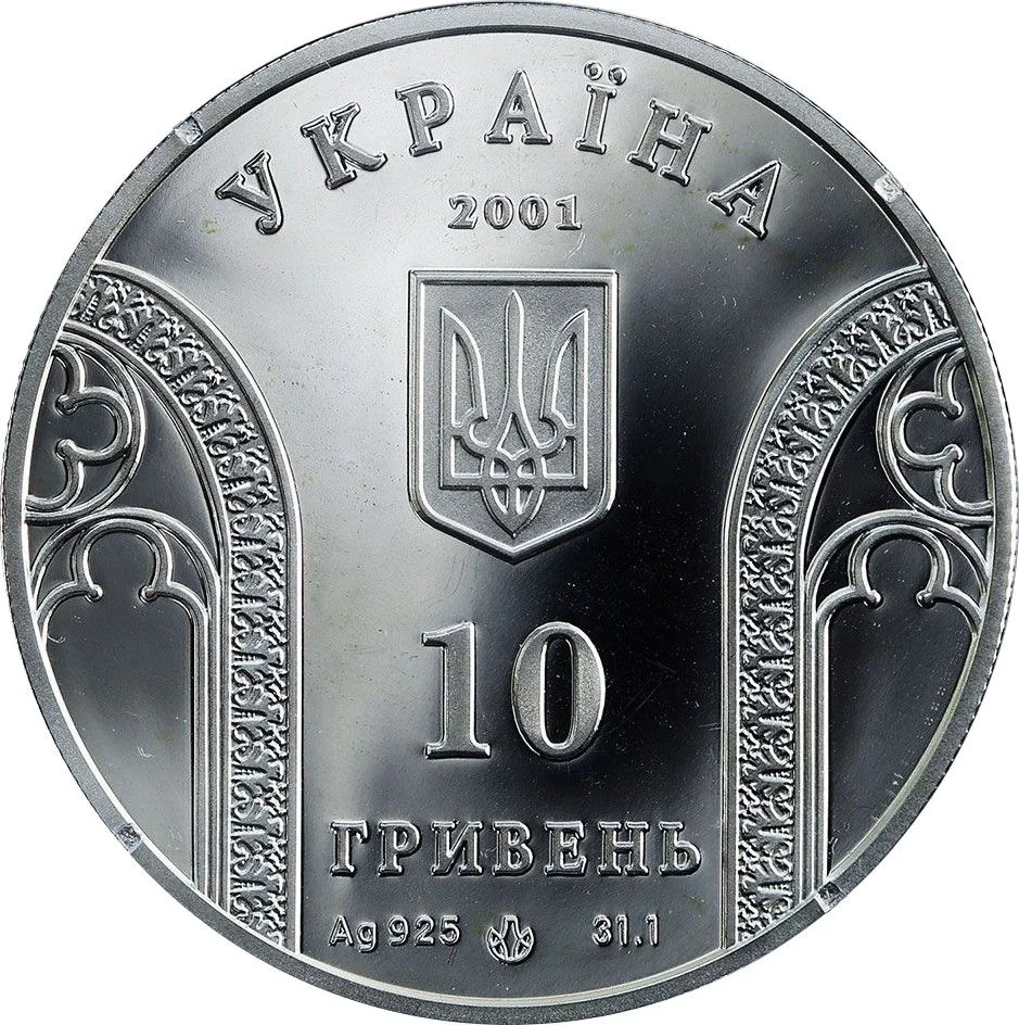 Between two ornamental slits are the small National Emblem of Ukraine, the inscriptions "УКРАЇНА, 2001, 10 ГРИВЕНЬ," the metal's specification, and the Mint's logotype.