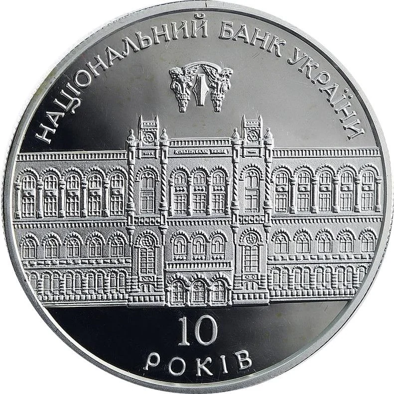 The facade of the bank's capital building (architects O. Kobeliev and O. Verbytskyi) features the National Bank of Ukraine logo, the circular inscription "НАЦІОНАЛЬНИЙ БАНК УКРАЇНИ," and below it, "10 РОКІВ."