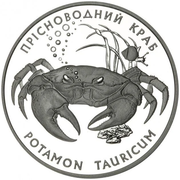 A freshwater crab and a snail in seaweed, with circular inscriptions: ПРІСНОВОДНИЙ КРАБ / (Freshwater Crab) and POTAMON TAURICUM.