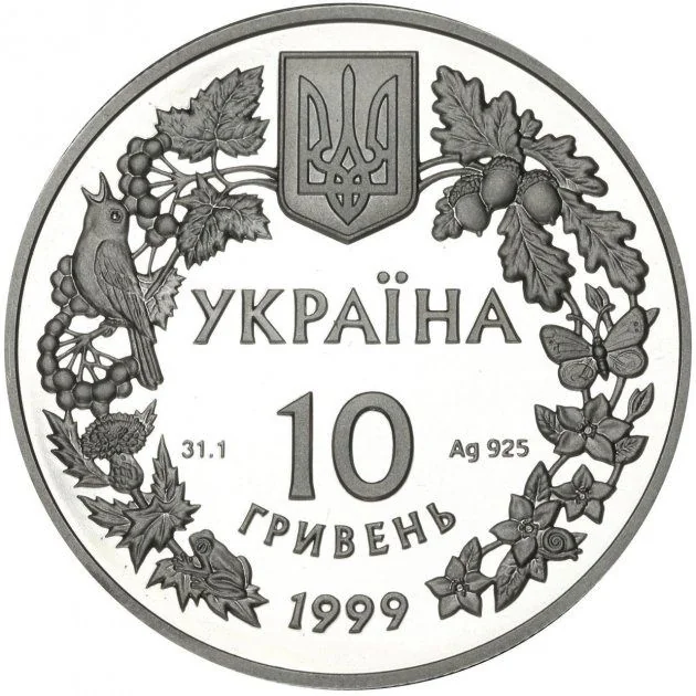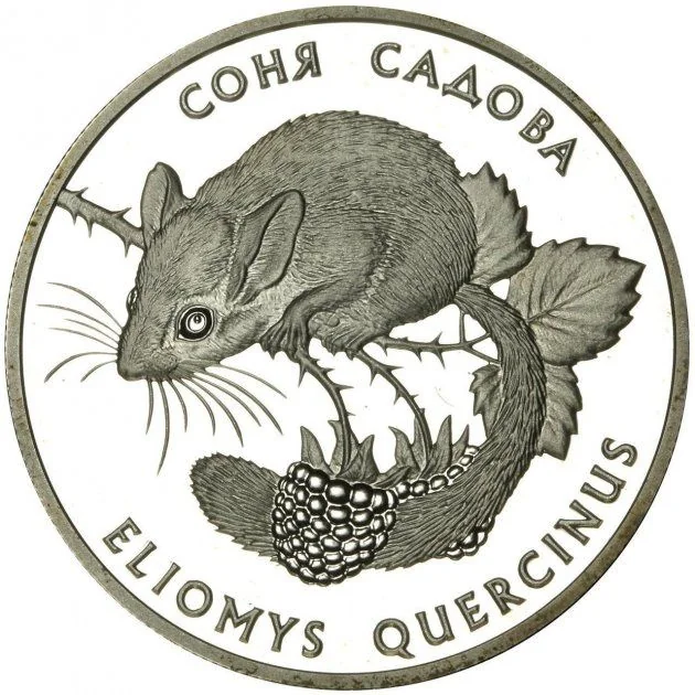 Description: An enlarged orchid is flanked by its stem with leaves and inflorescence on the left. On the right, a garden dormouse sits on a raspberry twig, surrounded by the legend: СОНЯ САДОВА (Garden Dormouse) and ELIOMYS QUERCINUS.