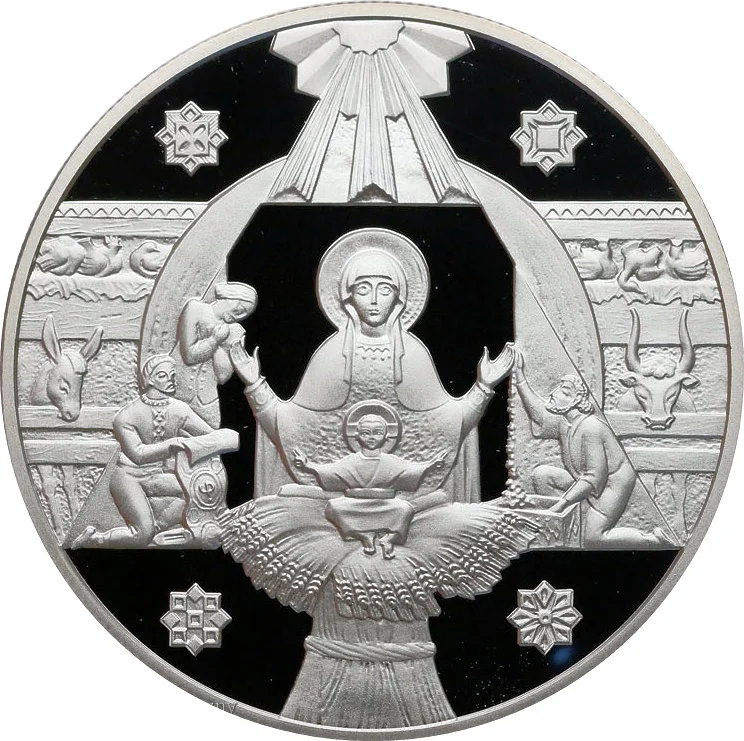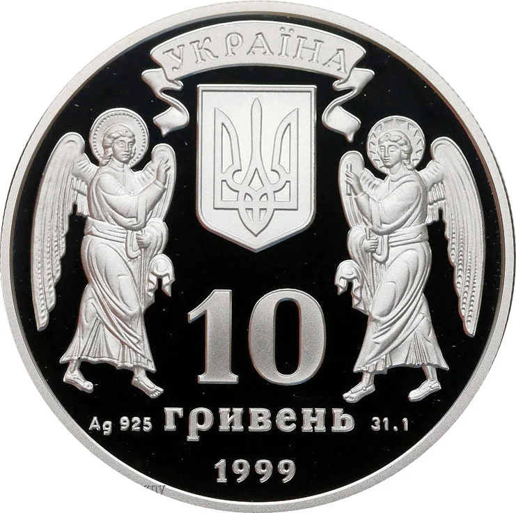 The small National Emblem of Ukraine is flanked by two angels, with the inscriptions: УКРАЇНА 10 ГРИВЕНЬ 1999, along with the metal, its fineness, and the coin's pure weight.
