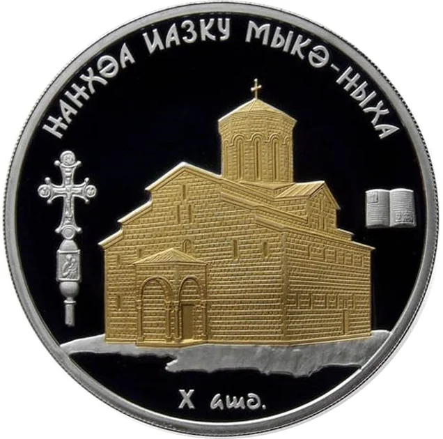 The central image is the Dormition Cathedral of Myku, flanked left by a processional cross and right by the Gospel from the archiepiscopal cathedra. Above, a semicircular inscription reads "Нанҳәа иазку Мықә-ныха" (The Dormition Cathedral of Myku). The date of the building's construction is inscribed below the cathedral.