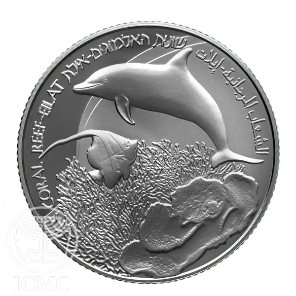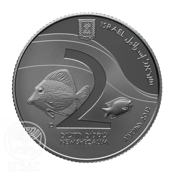 Israel's state emblem with "Israel" in three languages, mint year, and mark. Fish circle the central face value, with waves above.