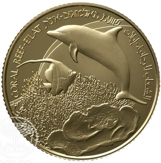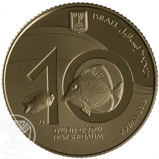Israel's state emblem with "Israel" in three languages, mint year, and mark. Fish circle the central face value, with waves above.