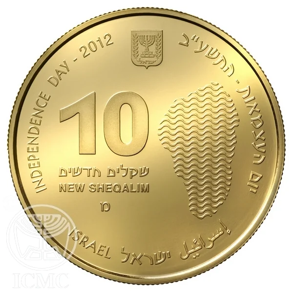 "Israel" in English, Hebrew, and Arabic, face value, mint year, State Emblem, and harp-shaped Sea of Galilee outline.