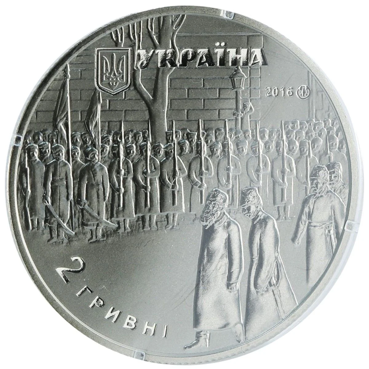 Legend: УКРАЇНА, small coat of arms, year 2016, and mint mark. Depicts Hrushevsky before troops. Below: 2 ГРИВНІ.