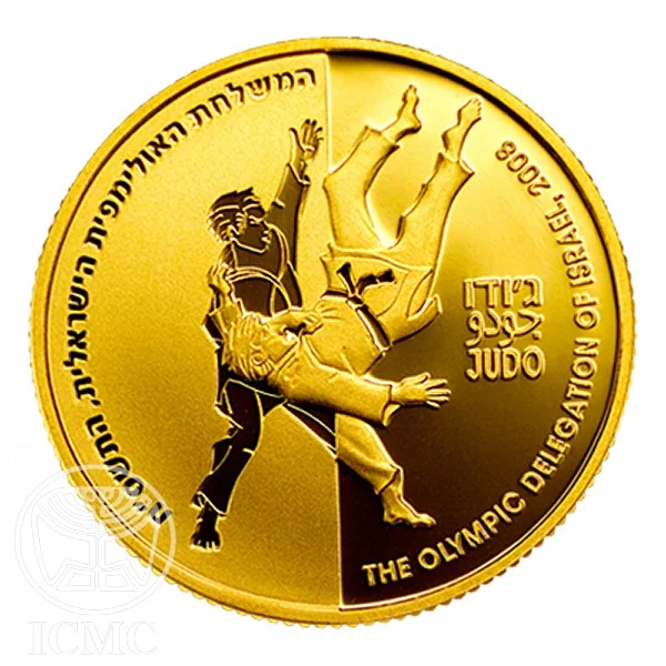 Face value in Hebrew and English, Israel's emblem, "Israel" in three languages, mint year, and a decorative Judo belt element symbolizing skill levels.