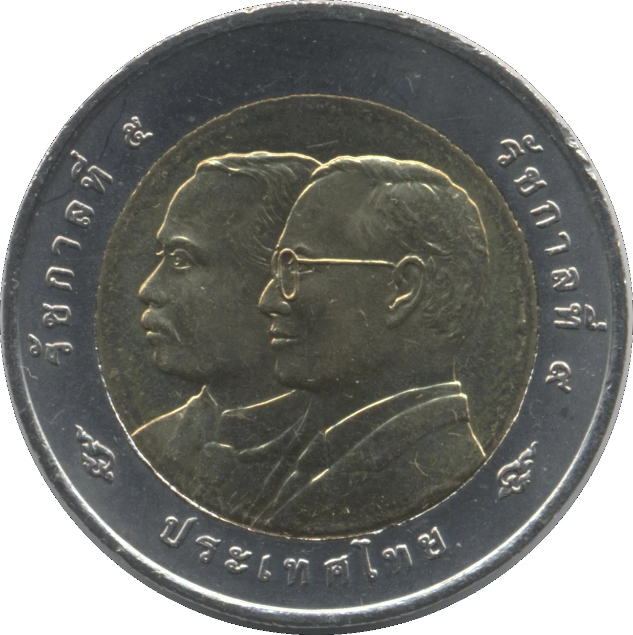 Conjoined left-facing busts of Kings Chulalongkorn and Bhumibol Adulyadej.