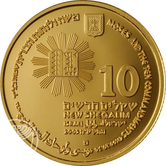 Description: Face value in Hebrew and English, Israel's emblem, "Israel" in three languages, and mint year. Left: a decorative Tablets of the Law with the first words of the Ten Commandments in ancient Hebrew, radiating light. Border inscription: "MOSES AND THE TEN COMMANDMENTS EXODUS 20:34" in Hebrew, English, and Arabic.