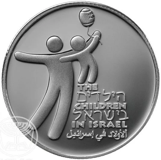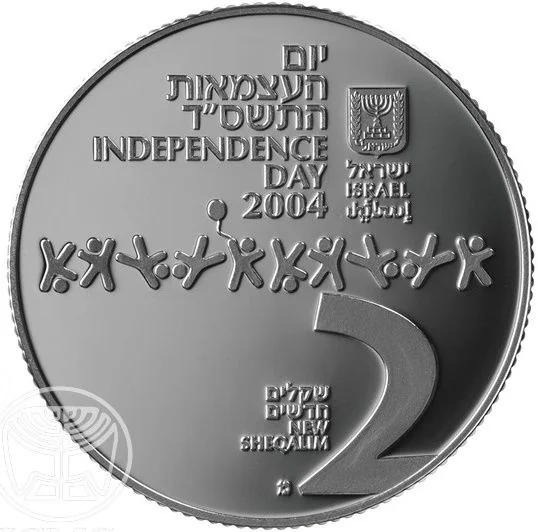Israeli State Emblem and "Israel" in three languages. "INDEPENDENCE DAY 2004" in Hebrew and English. Decorative motifs symbolizing joyful children and the mint year.