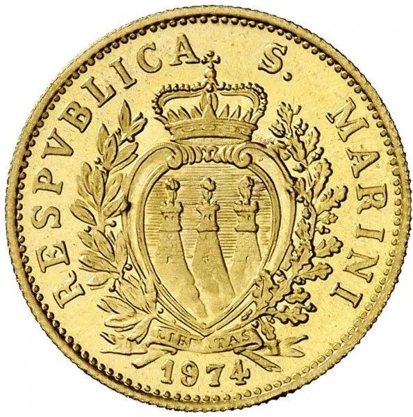 In 1974, San Marino’s currency situation was fundamentally defined by its close economic and monetary integration with Italy, governed by a series of bilateral treaties. The most important of these was the Convention of 1939, which established the Italian Lira as legal tender within the republic and granted San Marino limited rights to mint its own coinage. These Sammarinese coins, denominated in lire, were legally equivalent to their Italian counterparts and circulated interchangeably, but they were produced in strictly limited quantities, primarily for commemorative and collector purposes rather than for driving the domestic economy. The country had no central bank and did not issue paper currency, relying entirely on Italy for its circulating medium.