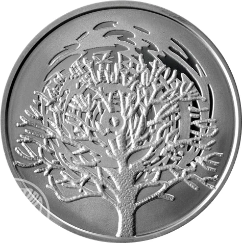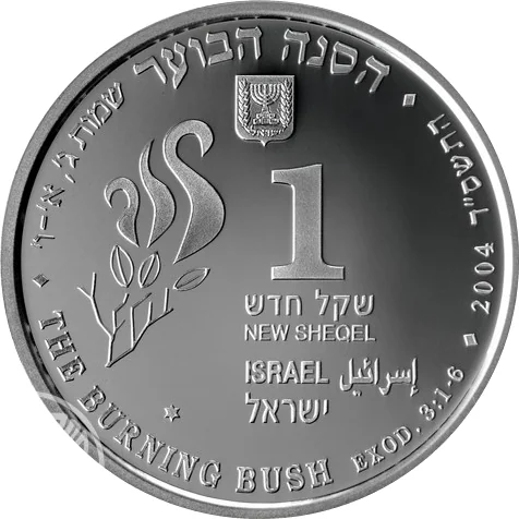 Face value in Hebrew and English, Israel State Emblem, "Israel" in three languages, mint year, burning bush branch, and border inscription "THE BURNING BUSH EXOD.3:1-6" in Hebrew and English.