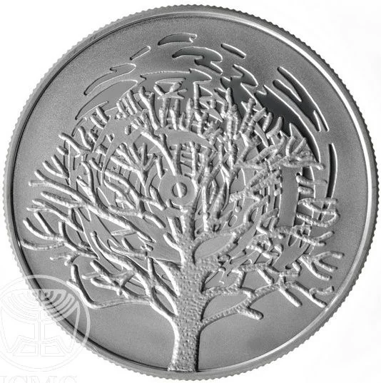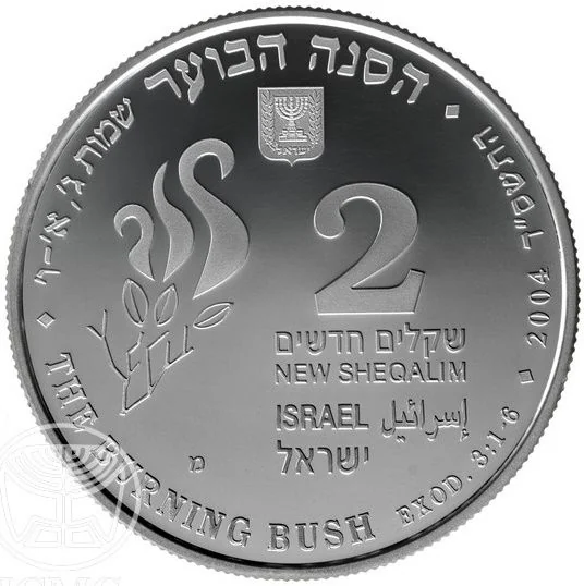 Face value in Hebrew and English, Israel State Emblem, "Israel" in three languages, mint year, burning bush branch, and border inscription "THE BURNING BUSH EXOD.3:1-6" in Hebrew and English.