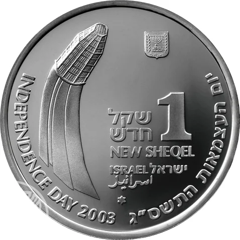 Israel State Emblem with "Israel" in three languages. "INDEPENDENCE DAY 2003" in Hebrew and English, featuring the Ofeq satellite.