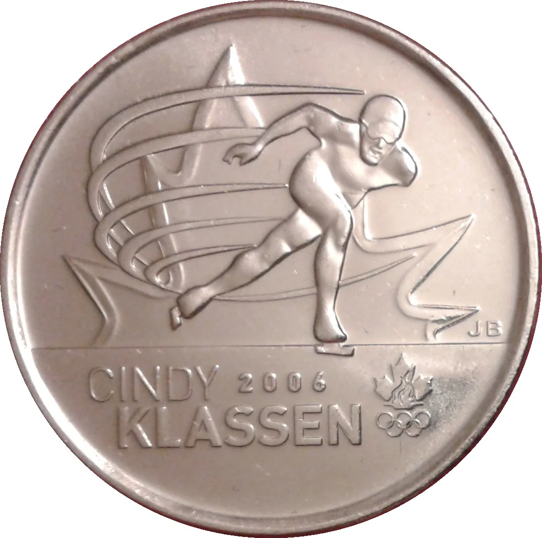 Cindy Klassen speed skater with maple leaf background, name and year, Canadian Olympic Committee logo.