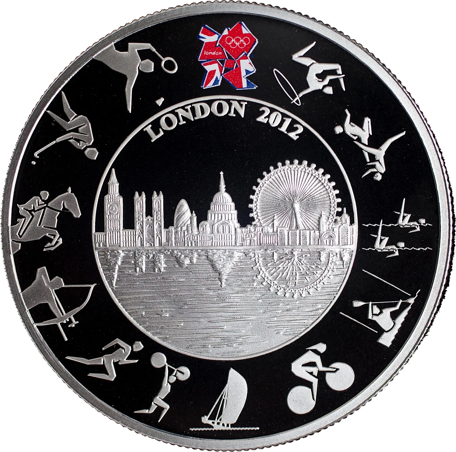 Featuring London's skyline and the River Thames, this design places athlete pictograms like a clock face around Big Ben. The official London 2012 Olympic emblem is in color at the top.