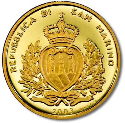 Crowned San Marino arms in heart shield, flanked by sprigs, motto below.