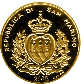 Crowned San Marino arms in heart shield, flanked by sprigs, motto below.