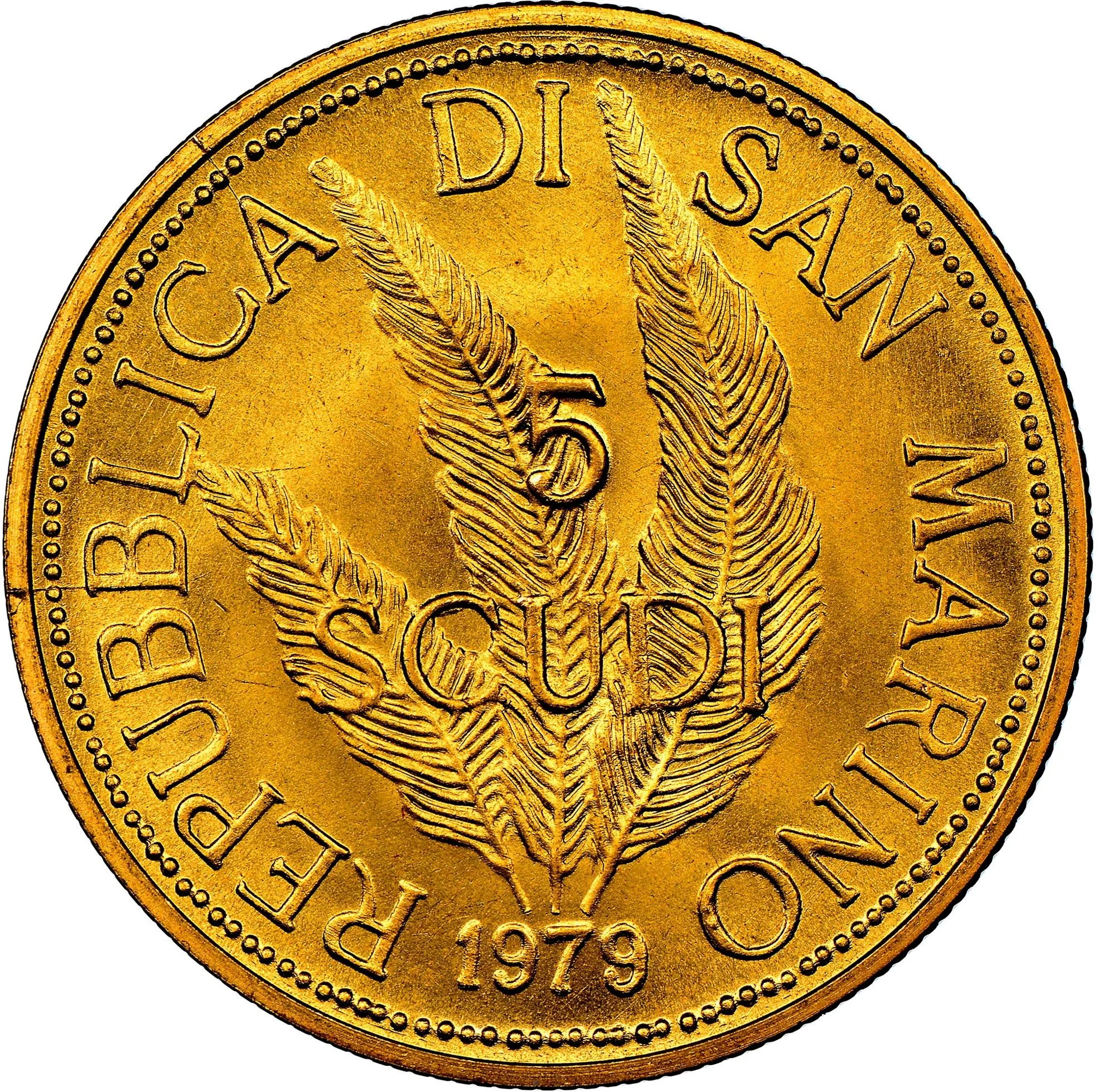 5 Scudi coin featuring San Marino's three feathers.