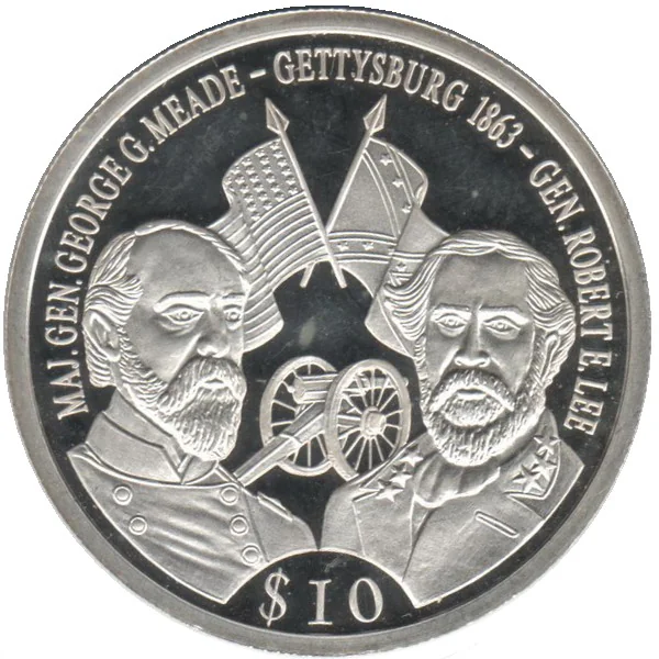 Busts of Generals Meade and Lee, artillery, and Union and Confederate flags.