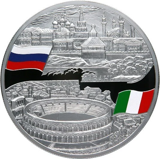 Upper section: relief of the Kazan Kremlin with "KAZAN" below; left rim: Russian flag.