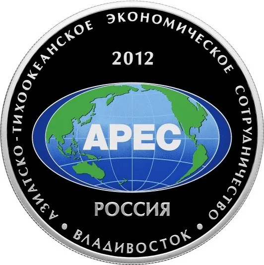 The mirrored center field features the APEC forum logo above "РОССИЯ," surrounded by the circular inscription "АЗИАТСКО-ТИХООКЕАНСКОЕ ЭКОНОМИЧЕСКОЕ СОТРУДНИЧЕСТВО ·ВЛАДИВОСТОК·".