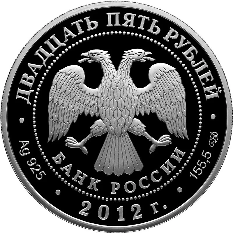 Center: Bank of Russia emblem (two-headed eagle, wings down, with "БАНК РОССИИ" below), circled by dots. Rim inscriptions: top - "ДВАДЦАТЬ ПЯТЬ РУБЛЕЙ"; bottom left - metal and fineness, center - "2012 г.", right - metal content and mint mark.