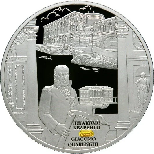 At the coin's center, between two columns and fragments of the Hermitage Theatre interior, G. Quarenghi is depicted on a mirrored field resembling water. He holds a paper scroll in his right hand and a model of the Assignat Bank in his bent left. The scroll reads "ДЖАКОМО КВАРЕНГИ" and "GIACOMO QUARENGI", separated by a colored Ionic capital. The Hermitage Theatre on the quay is shown in the background.