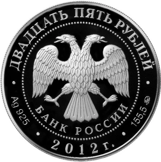 Center: Bank of Russia emblem (two-headed eagle, wings down, with "БАНК РОССИИ" below), circled by dots. Rim inscriptions: top - "ДВАДЦАТЬ ПЯТЬ РУБЛЕЙ"; bottom left - metal and fineness, center - "2012 г.", right - metal content and mint mark.