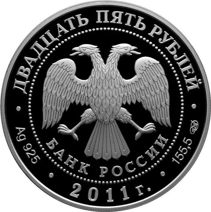Center: Bank of Russia emblem (two-headed eagle with wings down, over semicircular "БАНК РОССИИ"), within a dotted circle. Rim inscriptions: top - "ДВАДЦАТЬ ПЯТЬ РУБЛЕЙ"; bottom left - metal and fineness, center - "2011г.", right - fine metal content and mint mark.