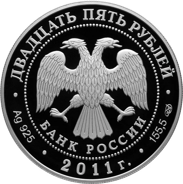 Center: Bank of Russia emblem (two-headed eagle, wings down, with "БАНК РОССИИ") within a dotted circle. Rim inscription: top - "ДВАДЦАТЬ ПЯТЬ РУБЛЕЙ"; bottom left - metal and fineness; center - "2011 г."; bottom right - metal content and mint mark.