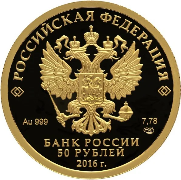 The State Coat of Arms of the Russian Federation in relief. Inscriptions: "РОССИЙСКАЯ ФЕДЕРАЦИЯ", "БАНК РОССИИ", "50 РУБЛЕЙ", "2016", metal designation, purity, the Saint Petersburg mint mark, and fine metal content.