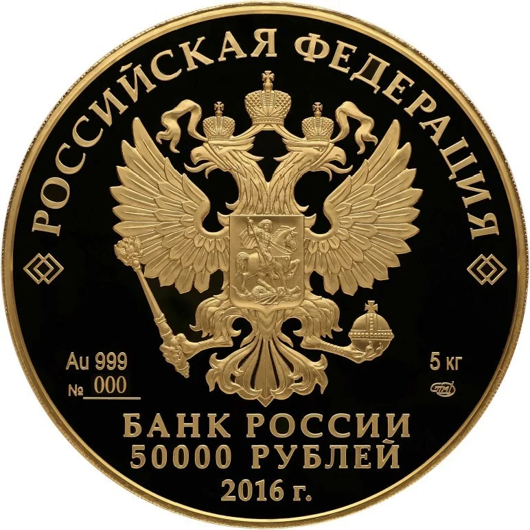 State Coat of Arms of the Russian Federation in relief. Inscriptions: "РОССИЙСКАЯ ФЕДЕРАЦИЯ", "БАНК РОССИИ", "50000 РУБЛЕЙ", "2016", metal symbol, purity, mint mark, and fine metal content.