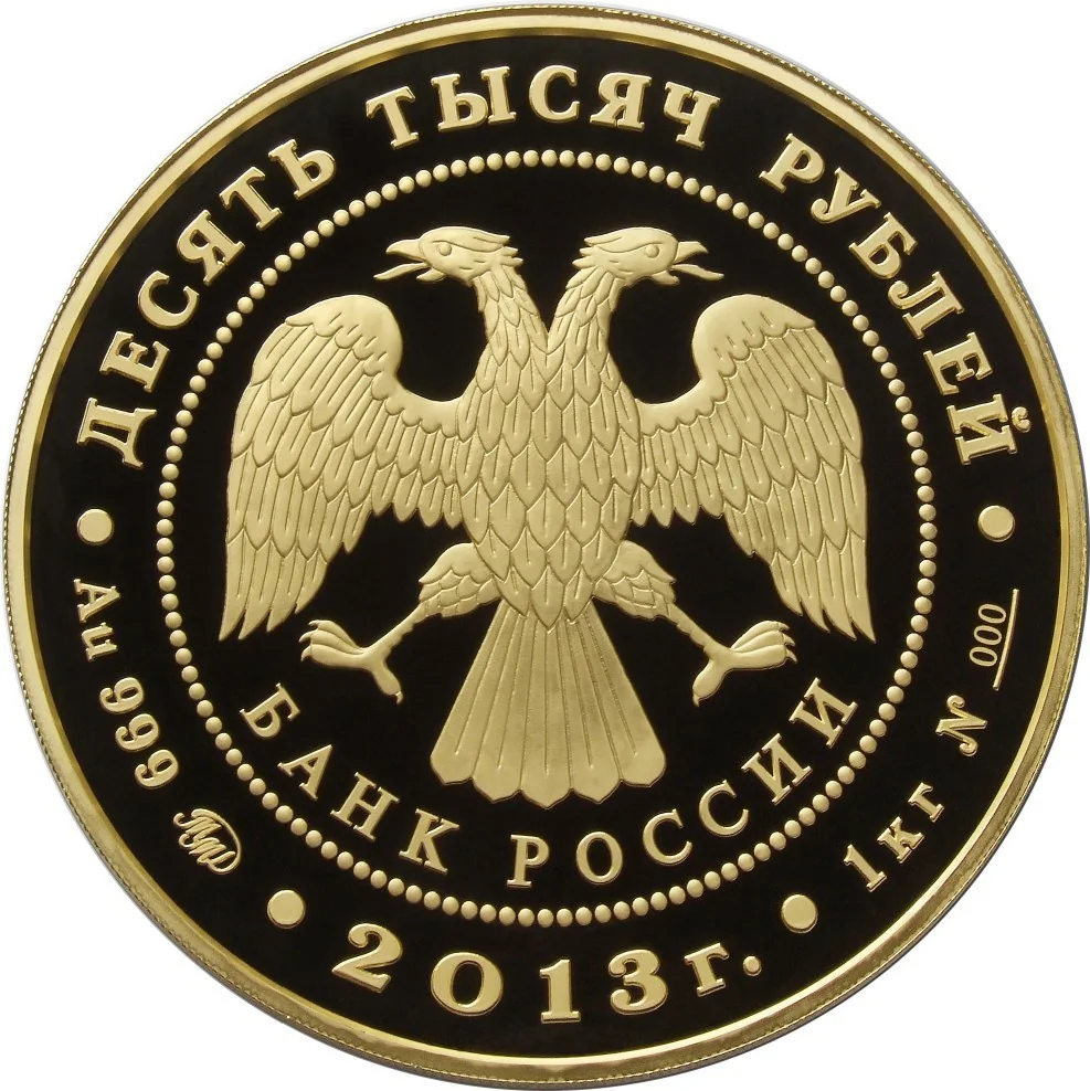 Center: Bank of Russia emblem (two-headed eagle, wings down, with "БАНК РОССИИ") within a dotted circle. Above: "ДЕСЯТЬ ТЫСЯЧ РУБЛЕЙ". Below left: metal, fineness, mint mark; center: year "2013 г."; right: fine metal content and serial number №___.