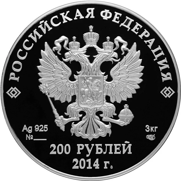 On the mirror field: the State Coat of Arms of the Russian Federation, above it a semicircular inscription "РОССИЙСКАЯ ФЕДЕРАЦИЯ". Below the coat of arms: on the left, the metal's chemical symbol, purity, and coin number; on the right, the fine metal content and mint mark. At the bottom center: "200 РУБЛЕЙ" and "2014 г."