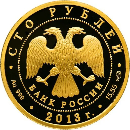 Central: Bank of Russia emblem (two-headed eagle, wings down, with "БАНК РОССИИ" below), within a dotted circle. Rim inscription: top - "СТО РУБЛЕЙ"; bottom left - metal and fineness; centre - "2013 г."; bottom right - fine metal content and mint mark.