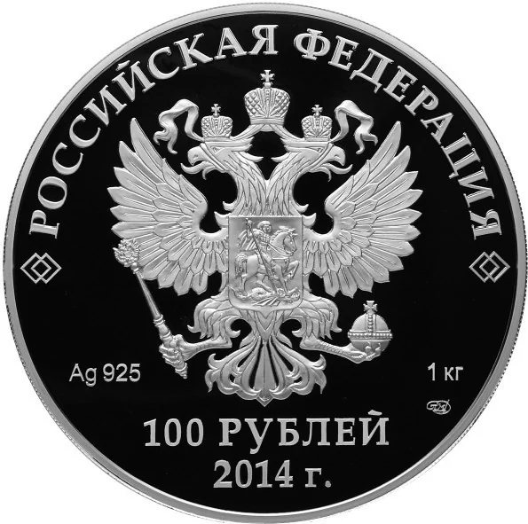 The mirror field features the State Coat of Arms of the Russian Federation. Above it, a semicircular inscription reads "РОССИЙСКАЯ ФЕДЕРАЦИЯ". Below the coat of arms: on the left are the metal and purity; on the right, the fine metal content and mint mark. At the bottom center are the denomination "100 РУБЛЕЙ" and the date "2014 г.".