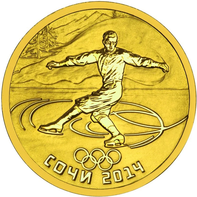 A skater in relief on a matted field, representing the first Winter Games. Below are the Olympic rings, "SOCHI," and "2014."