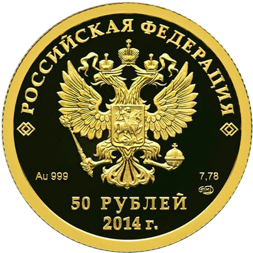 The mirror field features the relief State Coat of Arms of the Russian Federation. Above it, a semicircular inscription reads "РОССИЙСКАЯ ФЕДЕРАЦИЯ". Below the coat of arms: on the left are the metal and purity, on the right the fine metal content and mint mark. Centered at the bottom are the denomination "50 РУБЛЕЙ" and the date "2014 г.".