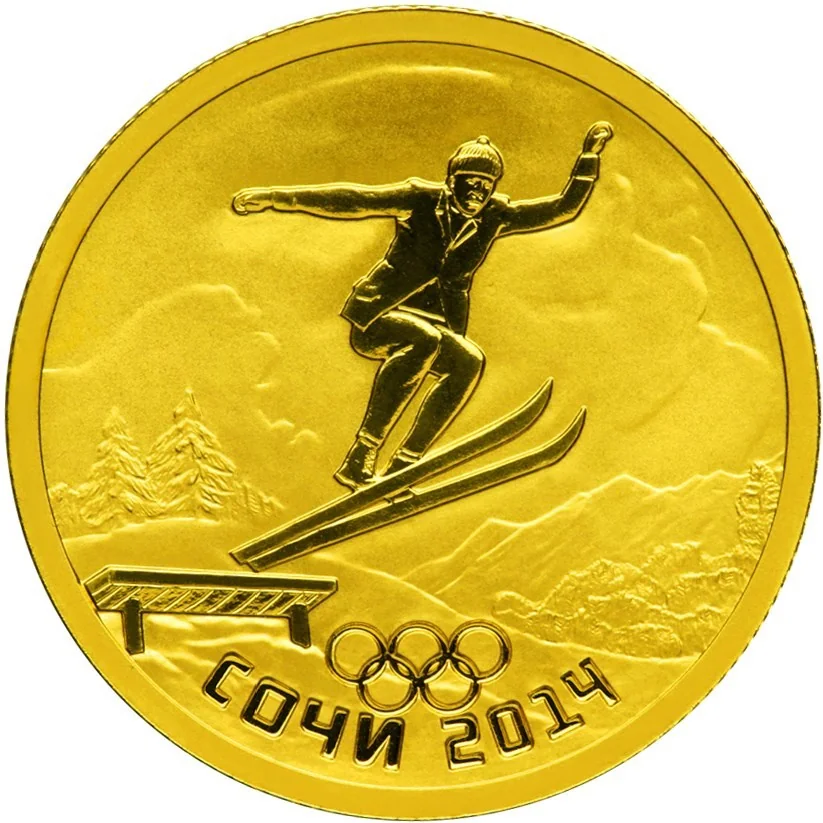 A matte field features a ski jumper from the first Winter Games, with the Olympic rings, "SOCHI," and "2014" below.