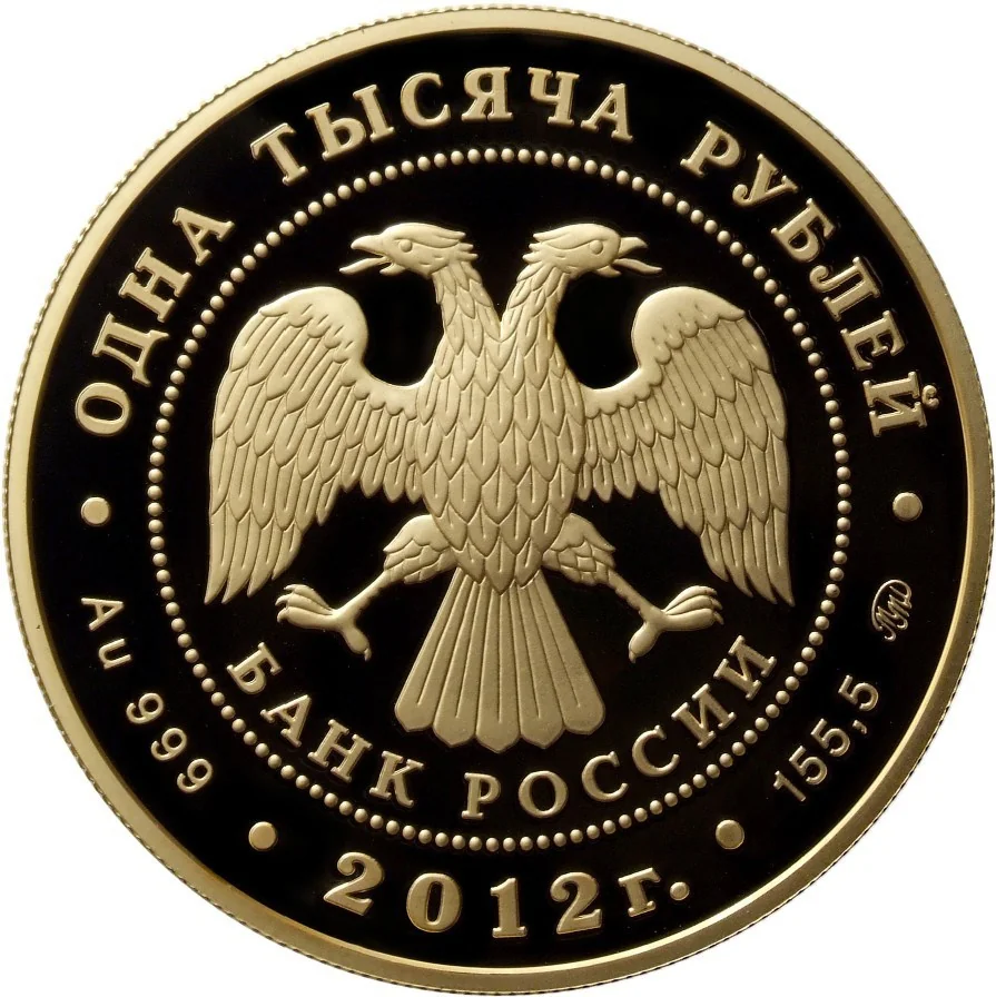 Center: Bank of Russia emblem (two-headed eagle, wings down, with "БАНК РОССИИ" below) within a dotted circle. Rim inscriptions: top - "ОДНА ТЫСЯЧА РУБЛЕЙ"; bottom left - metal and fineness; center - "2012 г."; bottom right - metal content and mint mark.