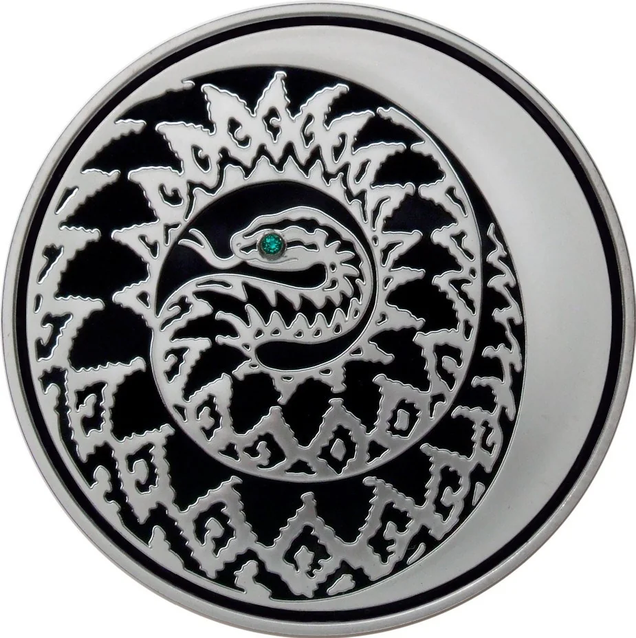 Left: a coiled snake with a crystal eye. Right: a matte half-moon.